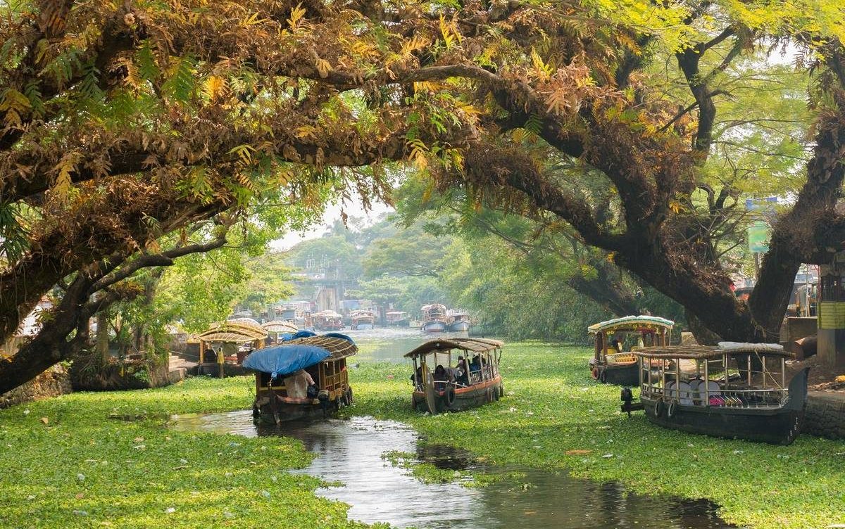 Experience the tranquil backwaters of Kerala as houseboats glide through peaceful canals and lush green lagoons.